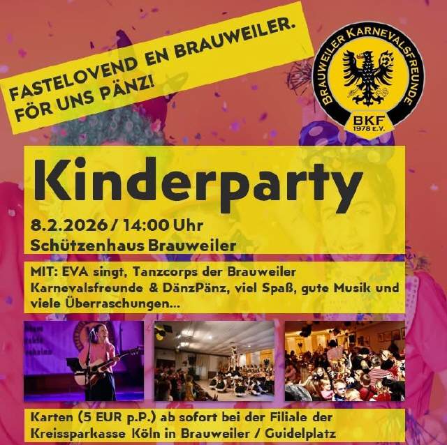 - Kinderkarneval der Brauweiler Karnevalsfreunde, Schützenhaus in Brauweiler , Beginn: 14 Uhr