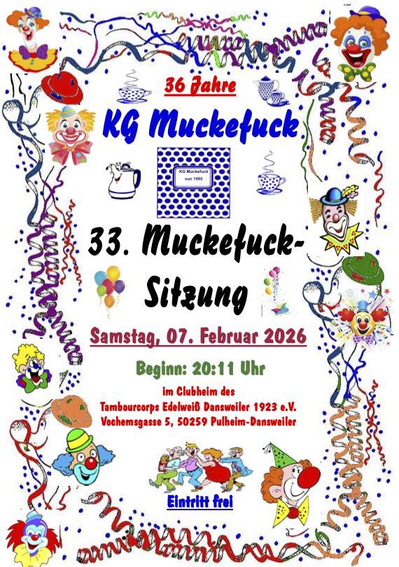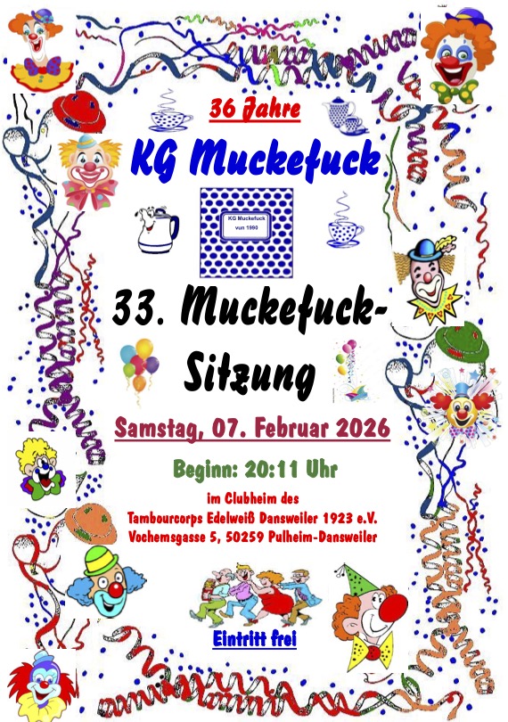 Am 07. Februar 2026 ging’s rund im Clubheim des Tambourcorps Edelweiß Donswieler: Die KG Muckefuck feierte ihr 33-jähriges Jubiläum, und ich durfte als Alleinunterhalter wieder mit dabei sein – und das schon seit vielen Jahren!