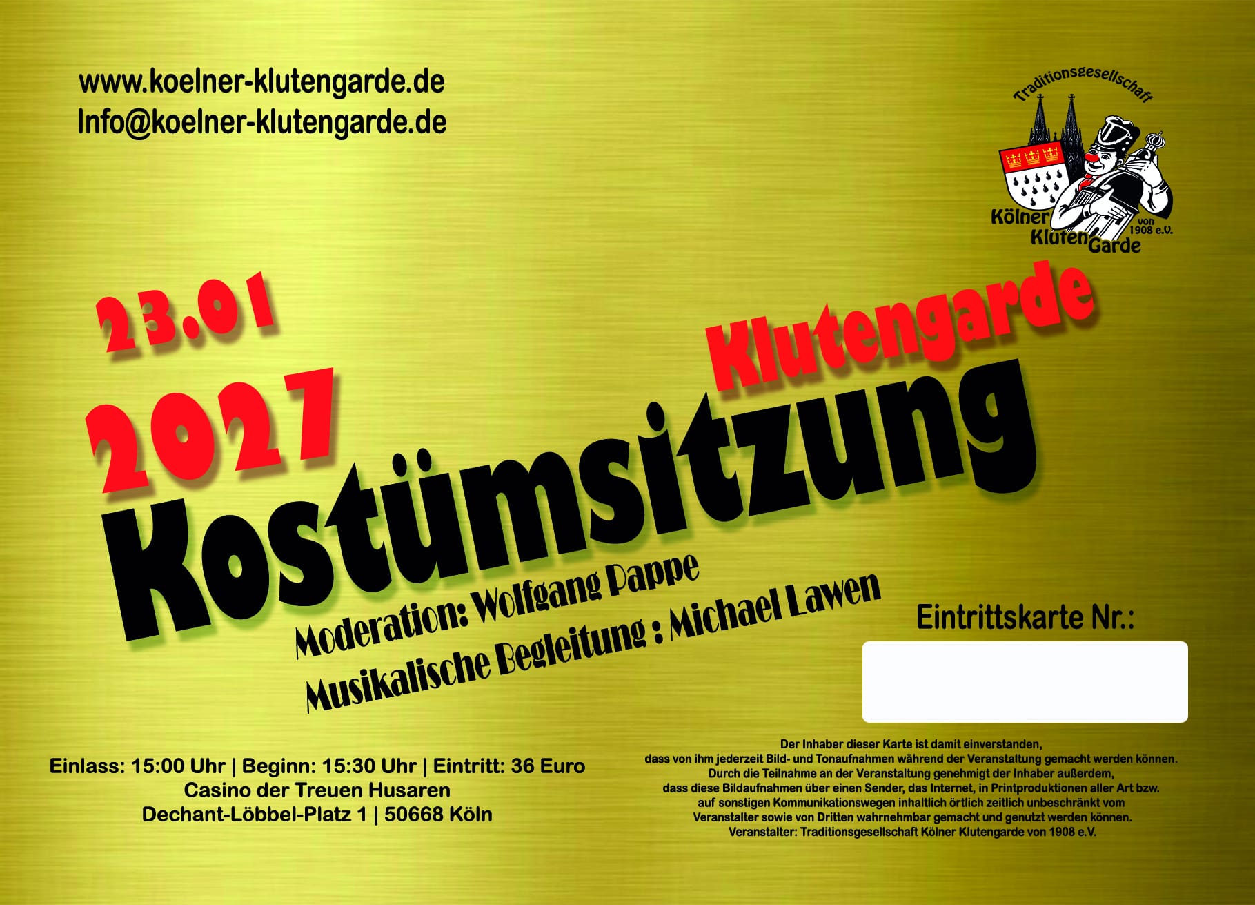 - Veedelssitzung der Kölner Klutengarde; Casino der Treuen Husaren, Dechant Löbbel Platz 1, 50668 Köln, Beginn: 15.30 Uhr